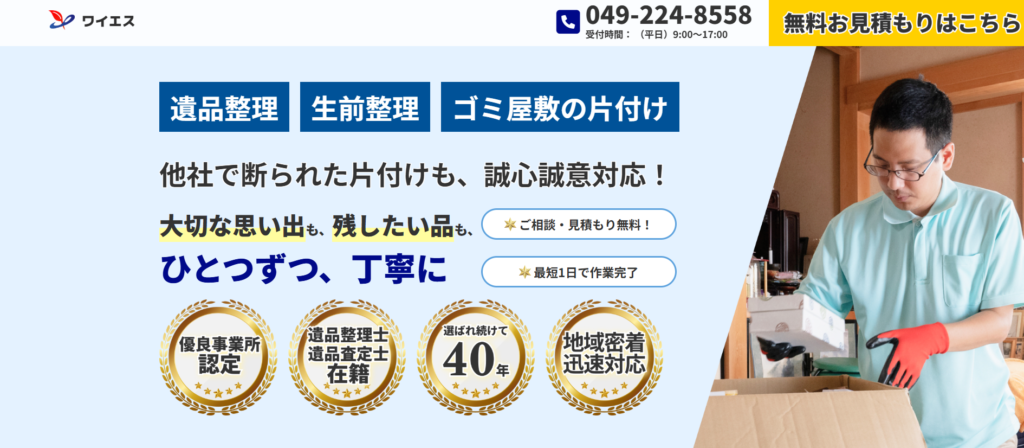 株式会社ワイエスは、埼玉県川越市を拠点に総合ビル管理業を展開する企業で、遺品整理や生前整理、空き家管理などのサービスも提供しています。1987年設立の実績を持ち、清掃業務で培ったノウハウを活かし、遺品の仕分けや搬出、清掃まで一括で対応できる体制が特徴です。