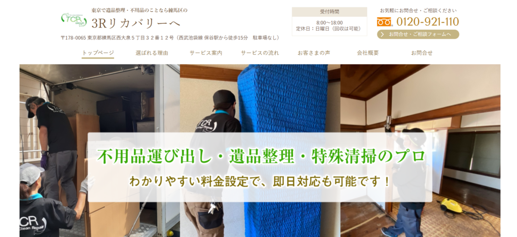 株式会社TCRが運営する3Rリカバリーは、東京都練馬区を拠点に遺品整理や生前整理、不用品回収などを提供する片付け専門業者です。遺品整理では、遺品整理士が在籍し、遺族や本人と相談しながら仕分けを行うなど、丁寧な対応を重視している点が特徴です。貴重品や思い出の品を確認しながら作業を進める体制が整っており、単なる処分ではなく心情面にも配慮した整理を行っています。