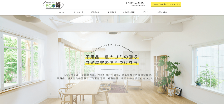 ECO侍は、大田区に営業所を構え、東京都・神奈川県・千葉県・埼玉県を対応エリアとする不用品回収業者です。不用品回収やゴミ屋敷清掃などのサービスの他、廃車・中古車の買取もおこなっています。