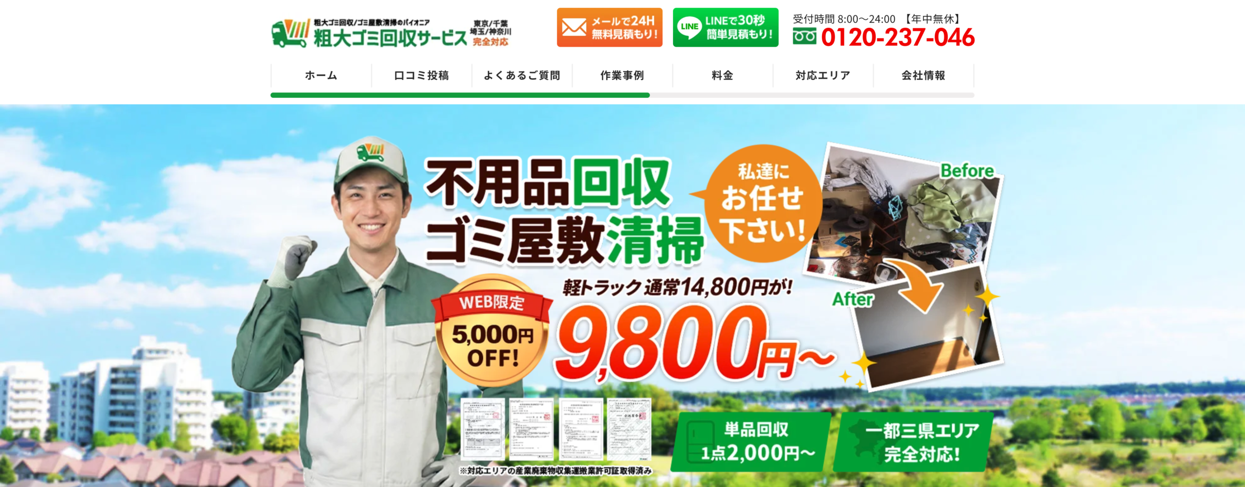 ゴミ屋敷の片付けや清掃を得意としており、1部屋から一軒家丸ごとまで規模を問わず迅速に対応。LINEやメールからは24時間いつでも予約が可能です。